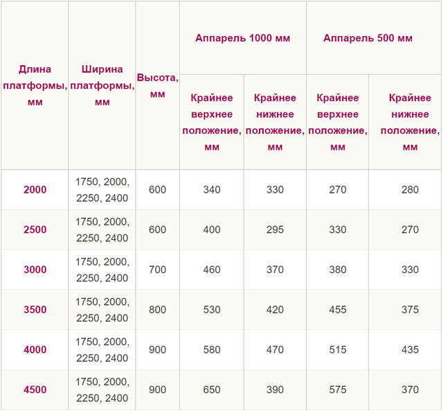 | Рекомендована довжина платформи, мм | 2000, 2500, 3000, 3500, 4000, 4500 |