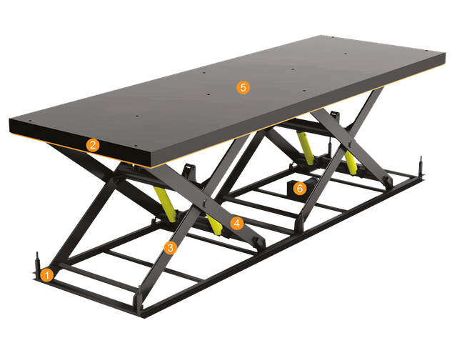 1. Основа столу; 2. Рамка безпеки столу; 3. Важілі зовнішні стола; 4. Важілі внутрішні стола; 5. Майданчик столу; 6. Гідравлічна станція.